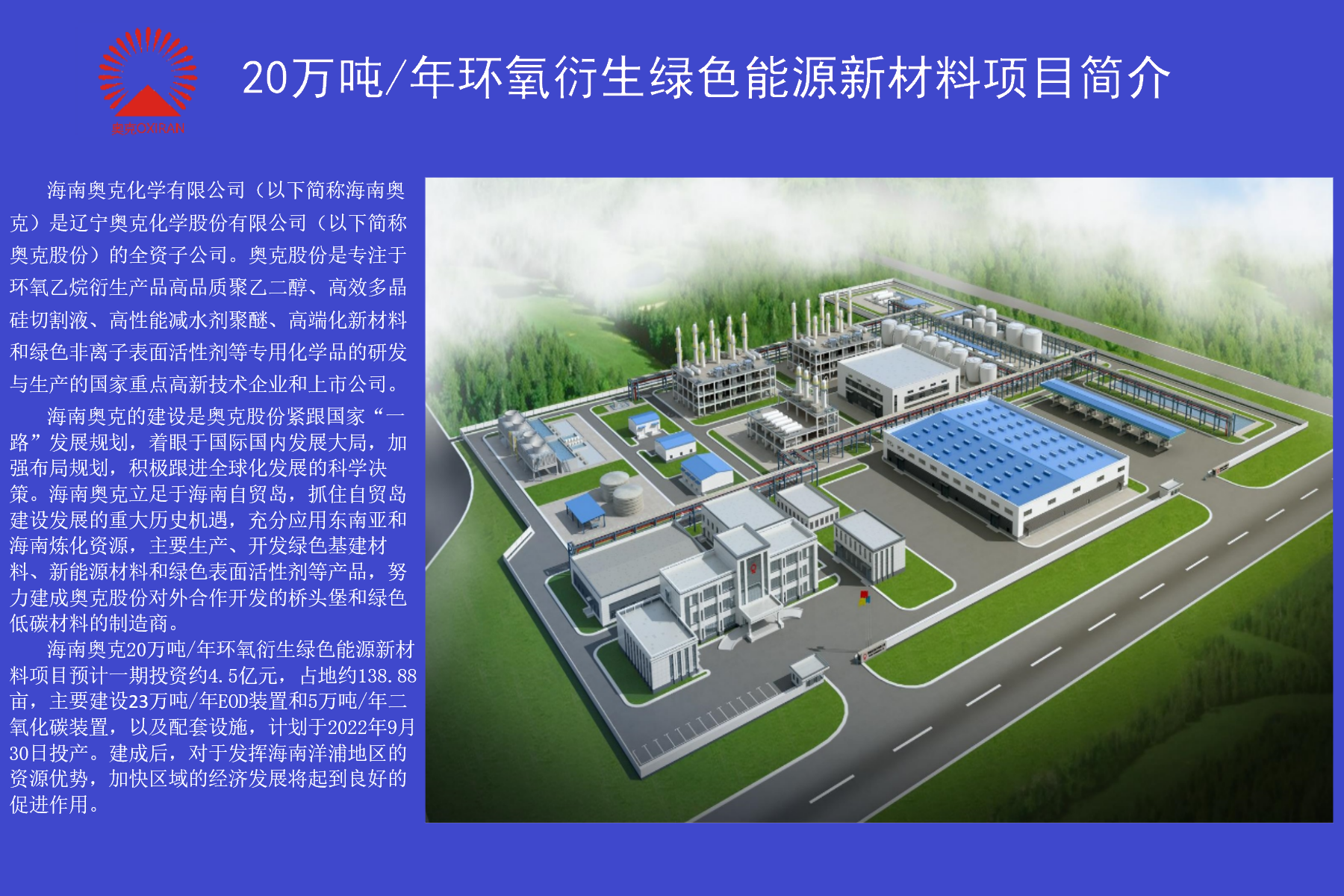 海南奧克是奧克股份在全國五大區域的拓展,前期在洋浦經濟開發區工委管委會、中國石化海南煉化公司、中石化化工銷售(海南)公司和洋浦國際等的大力支持下,于2021年2月5日注冊成立,注冊資本11,520萬元,占地面積約140畝,擬投資4.5億元,主要建設23萬噸/年EOD裝置以及配套設施,預計于2022年9月30日建成投產,主要生產、開發綠色基建材料、新能源材料和綠色表面活性劑等產品。該項目的投資建設,是奧克股份堅持“立足環氧乙烯創造價值”,滿足華南、海外東南亞不斷擴大市場的戰略需要;是奧克股份依托中石化海南煉化公司環氧乙烷原料優勢資源,為奧克快速發展和海南地方經濟做出貢獻的戰略需要;也是完善奧克的市場營銷網絡體系,打通現有區位空間格局,共同釋放協同效應,提升奧克在華南、海外等境內外的市場份額的戰略需要;更是面向奧克“十四五”規劃及2035遠景目標,邁向現代化、國際化發展的戰略需要。